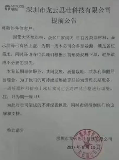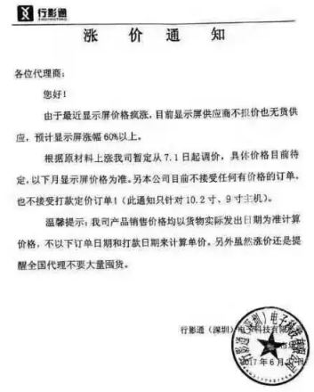 在6月11日,車載大屏機供應商互聯互通汽電科技向代理商發(fā)布漲價通知:由于記錄儀、導航儀屏、車機屏、云鏡屏截至今天上漲10%,一周后產品出貨價上調10%。