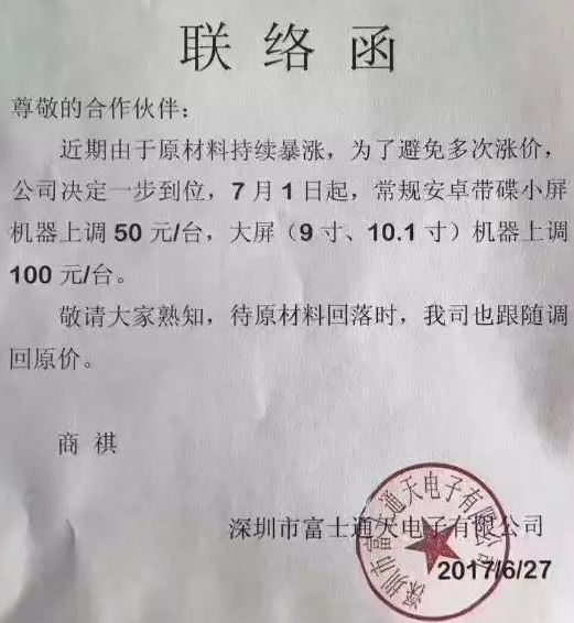 物聯網還沒來,物料價格卻一天比一天瘋狂。國內同質競爭環(huán)境讓大部分電子產品制造業(yè)者利潤低微,一直以來靠走量取勝。上游原材料價格在高位繼續(xù)上揚,讓下游終端廠商有苦難言。目前,智能后視鏡、車載導航客戶訂單需求旺盛卻回款緩慢,物料價格早已超出車機廠家運營成本亟需現金支撐,加上國內中小制造業(yè)者融資成本太高,車載大屏機廠商終于扛不住了,很大一部分廠商紛紛發(fā)函喊漲…